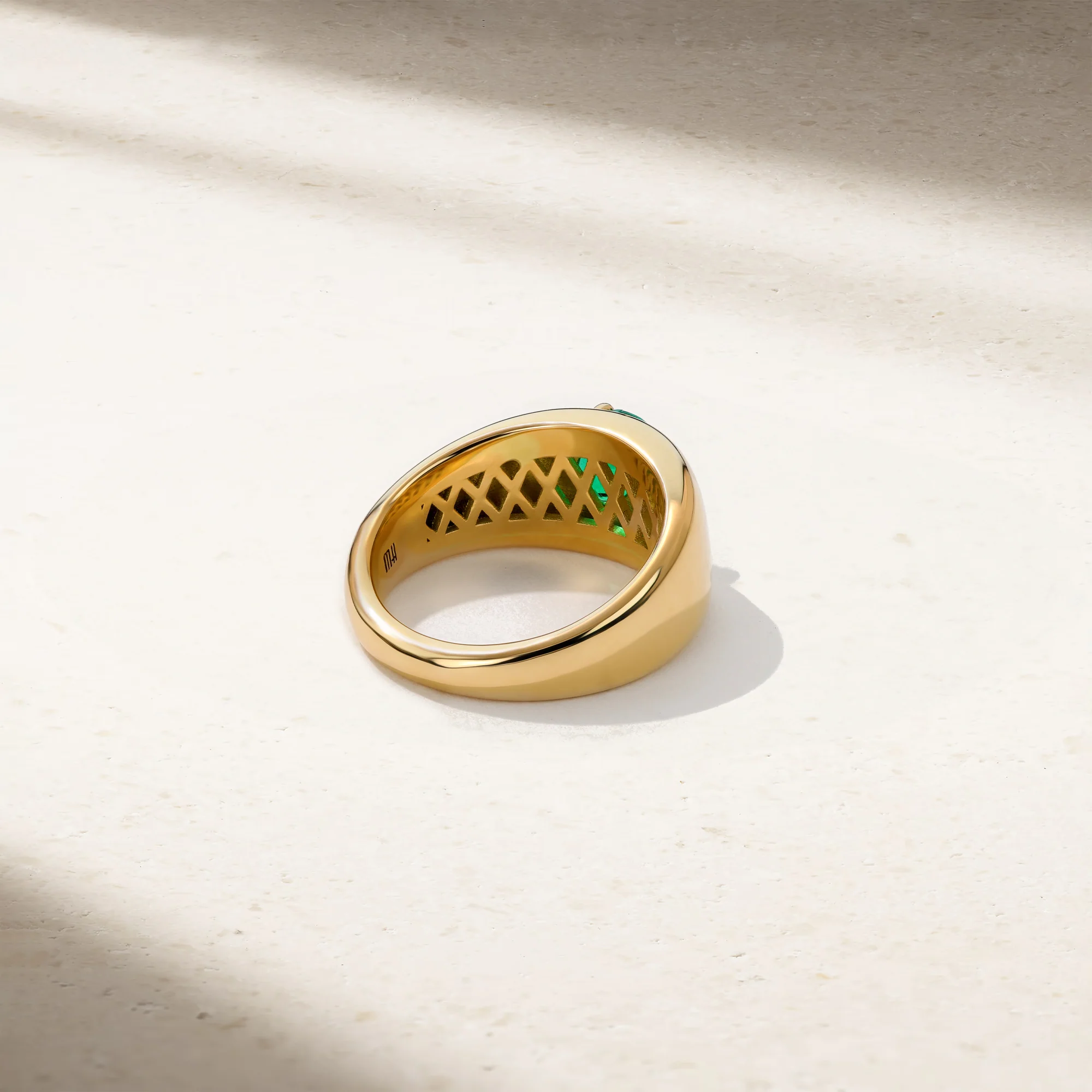 Striking in scale and rich in detail, this substantial cigar band is a modern statement with refined nuance. A vivid oval shaped emerald is set slightly off-center, creating an artful asymmetry that draws the eye. Surrounding it, a crescent of burnish-set diamonds glimmers across the surface of high-polish gold, echoing the organic flow of light and form. Bold yet thoughtfully composed, this piece embodies the essence of contemporary luxury — powerful, polished, and unapologetically refined. Wear it solo for maximum impact or pair it with slender bands to create a dynamic, layered look.