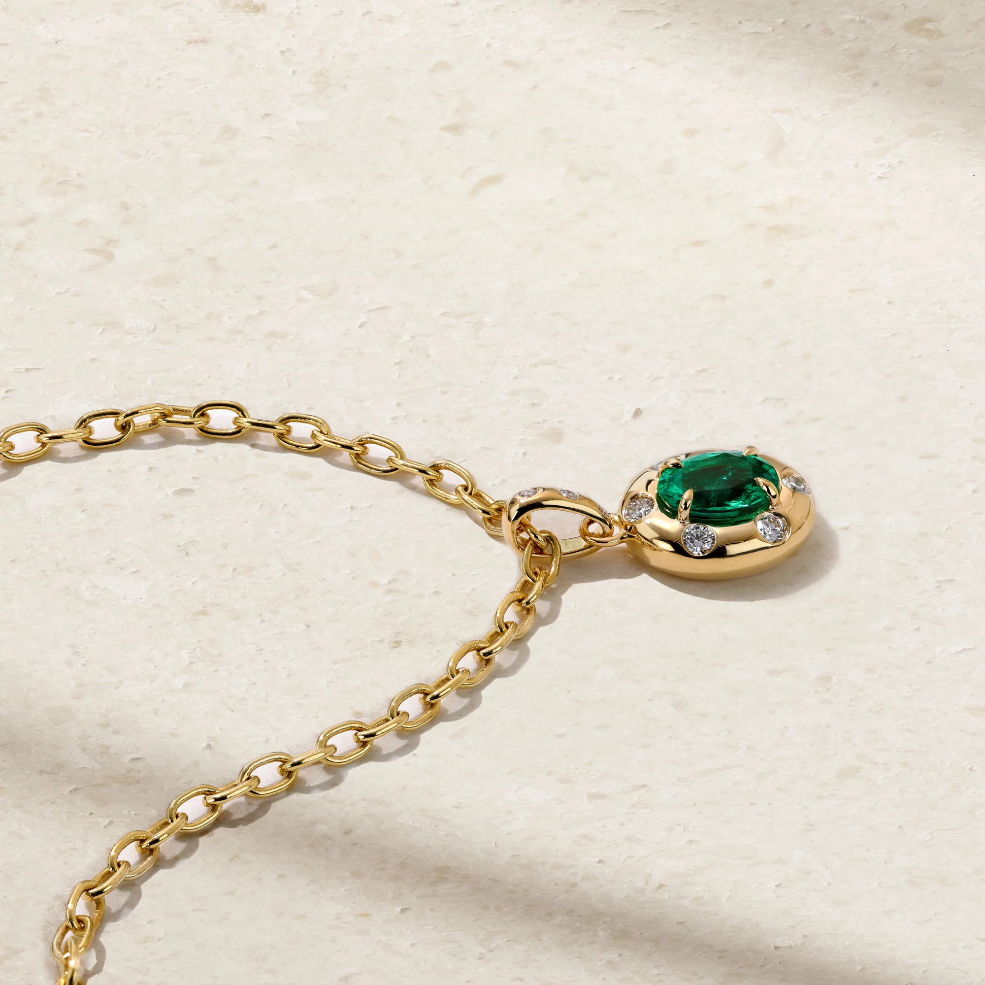 Defined by its bold gold silhouette, this pendant embodies refined modernism with a touch of timeless charm. A polished, substantial frame is delicately accented with twinkling burnish-set diamonds, creating a subtle interplay of light and texture. At its center, a luminous oval-cut emerald is poised in elegant prongs, offering a vibrant focal point. Suspended from an 18" fancy cable link chain, this piece layers effortlessly or stands alone with quiet sophistication.