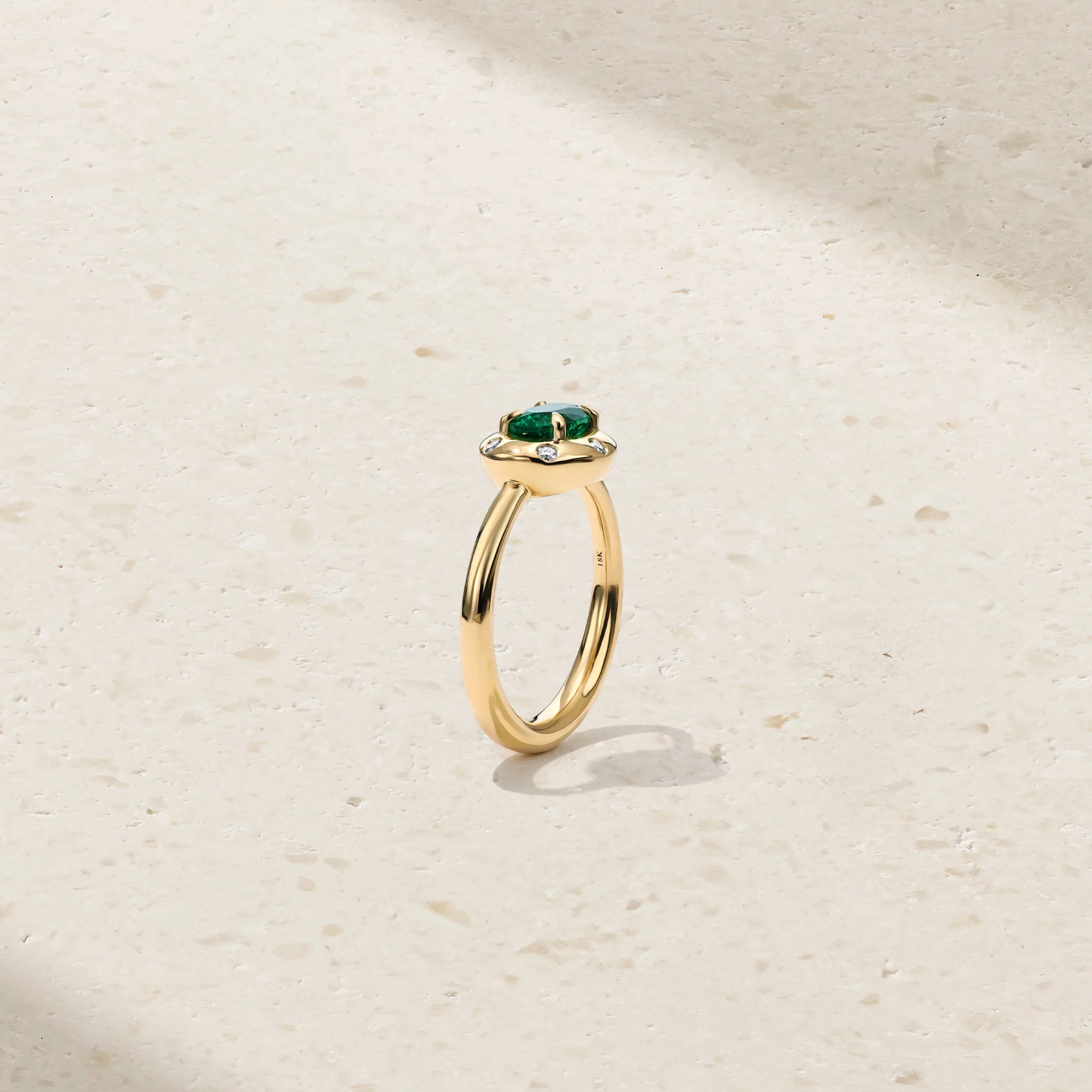 Sculptural and sleek, this modern ring centers on a luminous oval shaped emerald, secured in elegant prongs and framed by a bold plane of polished gold. The clean silhouette is elevated by burnish set diamonds, thoughtfully scattered across the surface to create a quiet shimmer. Balancing soft curves with contemporary structure, this piece offers a refined take on everyday luxury — striking on its own, yet timeless enough to wear effortlessly.