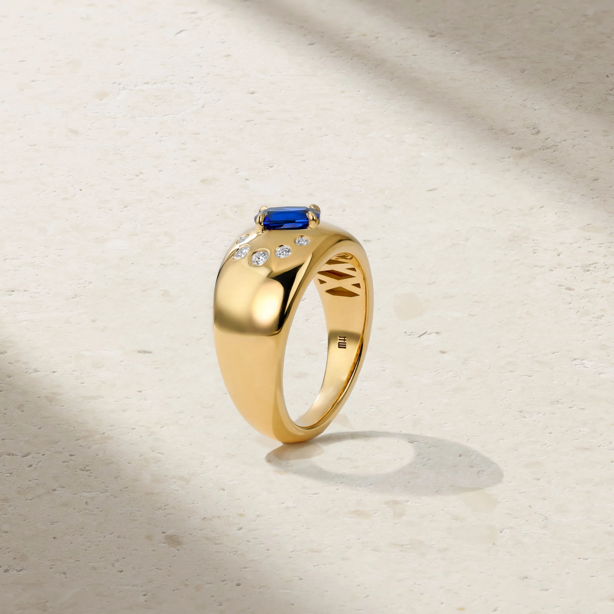 Bold in presence and artful in design, this substantial cigar band showcases a richly hued cushion cut sapphire, set slightly off-center for a modern, sculptural effect. A crescent of burnish-set diamonds arcs gracefully along the polished gold surface, catching the light with every movement. The interplay of symmetry and asymmetry, form and brilliance, creates a piece that feels both powerful and poetic. Wear it solo for a statement of quiet strength, or style it with slimmer bands for a layered look that’s distinctly your own.