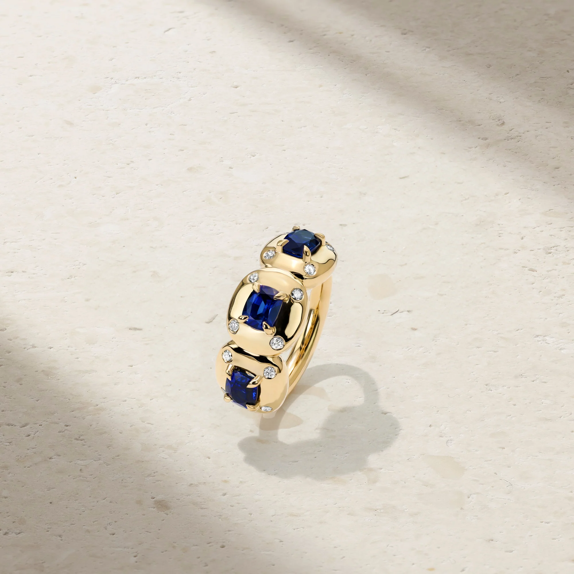Modern yet enduring, this refined band showcases three cushion shaped sapphires, each cradled in elegant prongs and framed by a smooth expanse of rich, polished gold. The softly squared silhouettes of the sapphires lend a timeless sophistication, while burnish-set diamonds add subtle brilliance throughout the band. Sculptural and beautifully balanced, this piece offers a distinctive expression of color and craftsmanship — whether worn solo or layered into a striking stack.