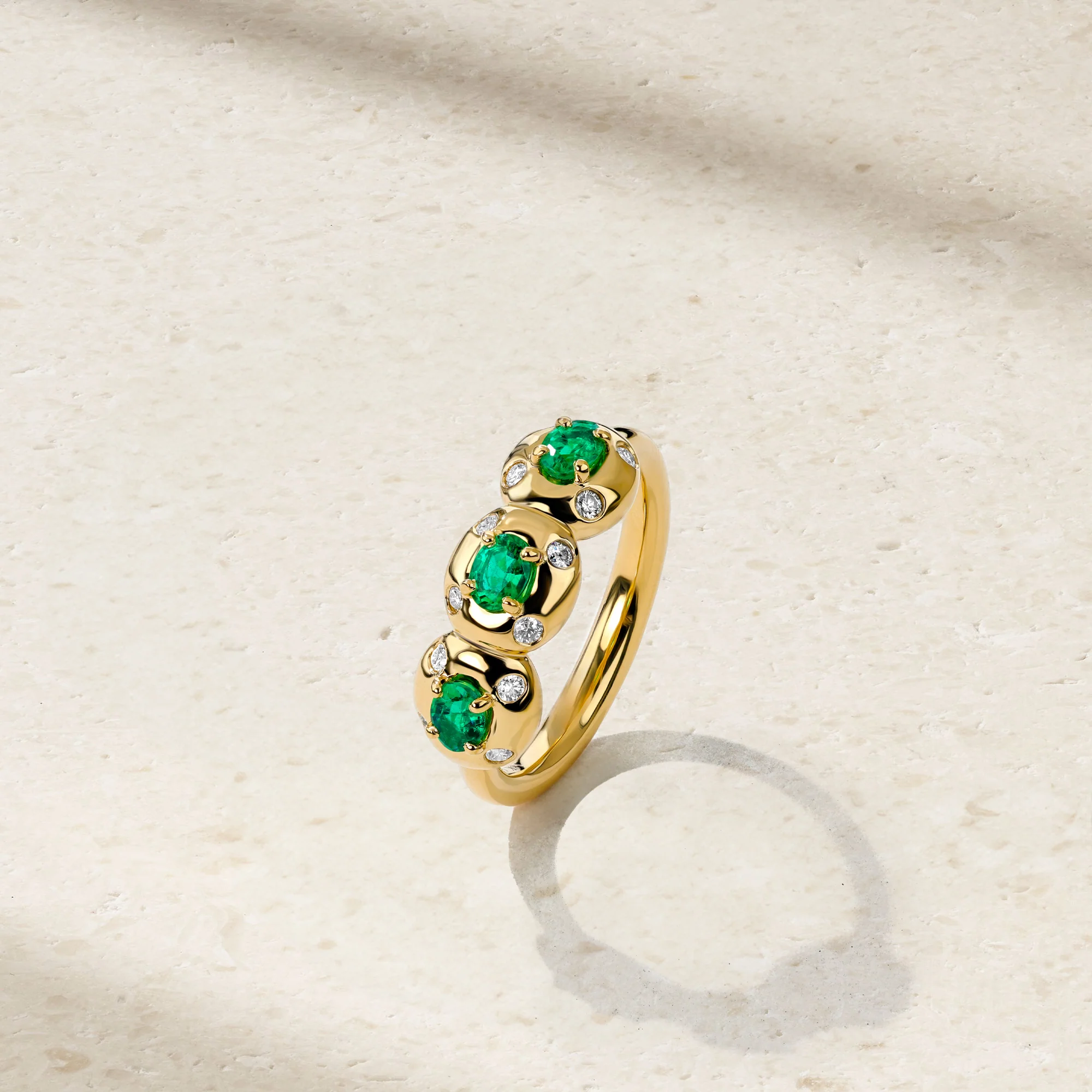 A modern classic with sculptural charm, this band features three oval shaped emeralds, each set in refined prongs and framed by smooth contours of polished gold. Burnish-set diamonds are thoughtfully interspersed throughout the gold surface, adding a subtle sparkle that catches the light from every angle. With its clean lines and balanced proportions, this design offers a contemporary take on a timeless motif — perfect worn alone or as a distinctive addition to a curated stack.