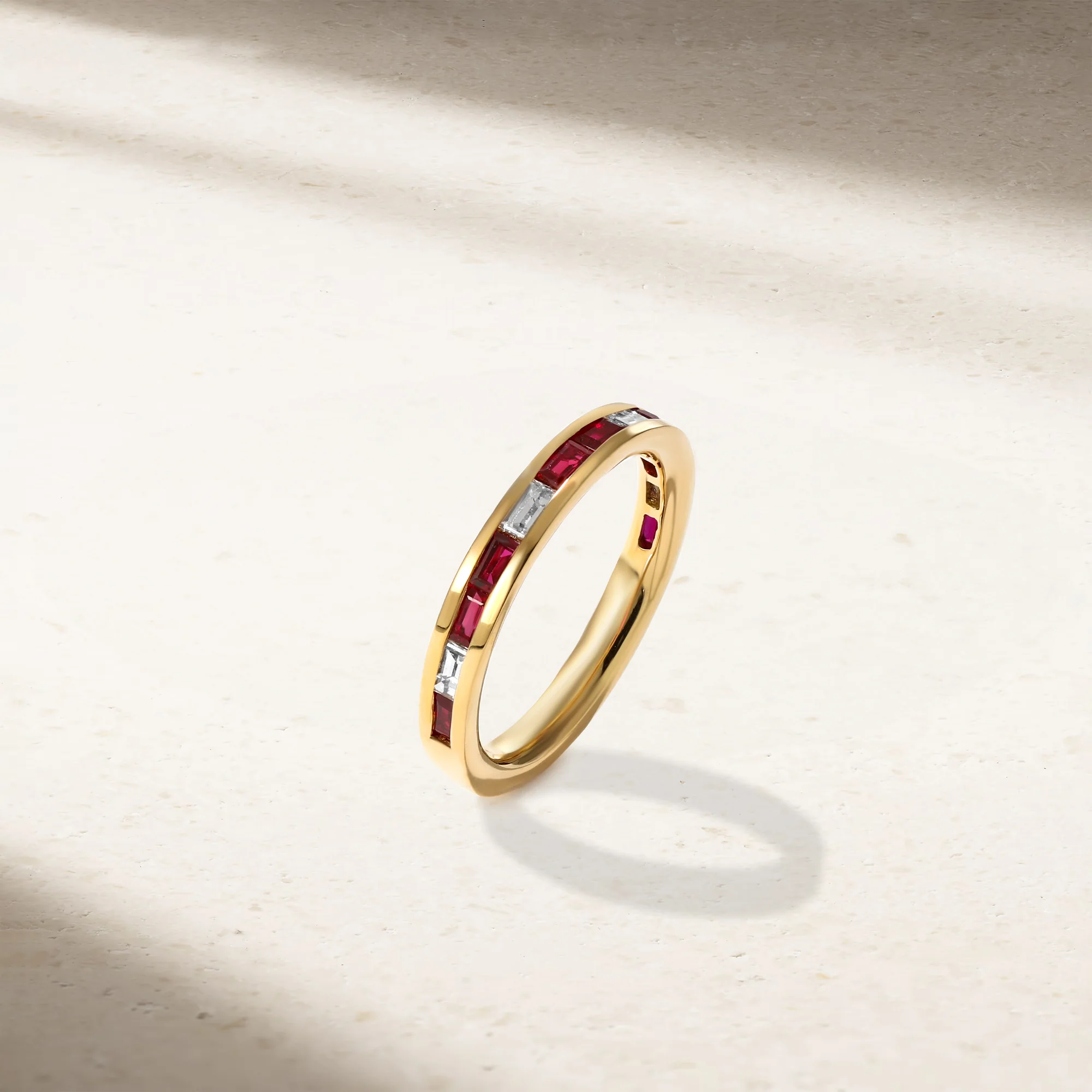 Beautiful and timeless, our Baguette Ruby and Diamond Thread Ring, with its combination of the rich red hues and the colorless brilliance, will make a thoughtful gift to mark any special occasion. It features a row of impeccably matched rectangular stones that are channel set within the confines of two thin walls of gold. We recommend wearing it solo or stacking together with other thin gem studded bands.