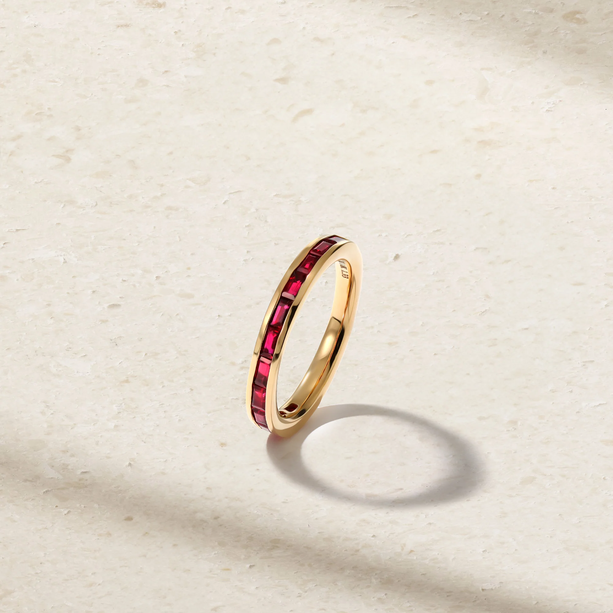 Beautiful and timeless, our Baguette Ruby Thread Ring, with its rich red hues, will make a thoughtful gift to mark any special occasion. It features a row of impeccably matched rectangular rubies that are channel set within the confines of two thin walls of gold. We recommend wearing it solo or stacking together with other thin gem studded bands.