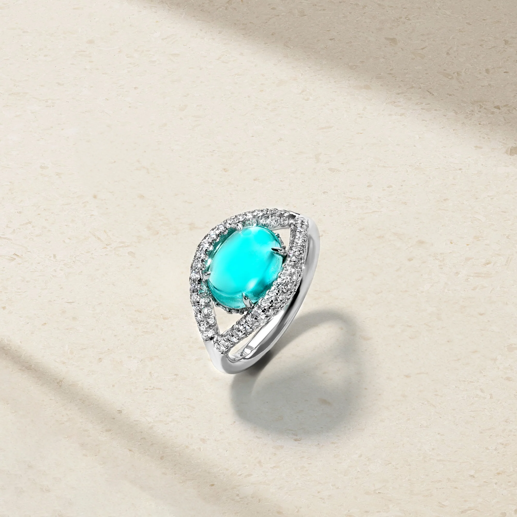 An ancient symbol believed by many to offer protection and wellbeing, this elevated evil eye design is centered with a fabulous oval shape Paraiba tourmaline cabochon while the curved bands surrounding the center gem are encrusted with scores of glinting diamonds. The larger scale of the ring makes it an exceptionally impressive cocktail ring best suited for special occasions.