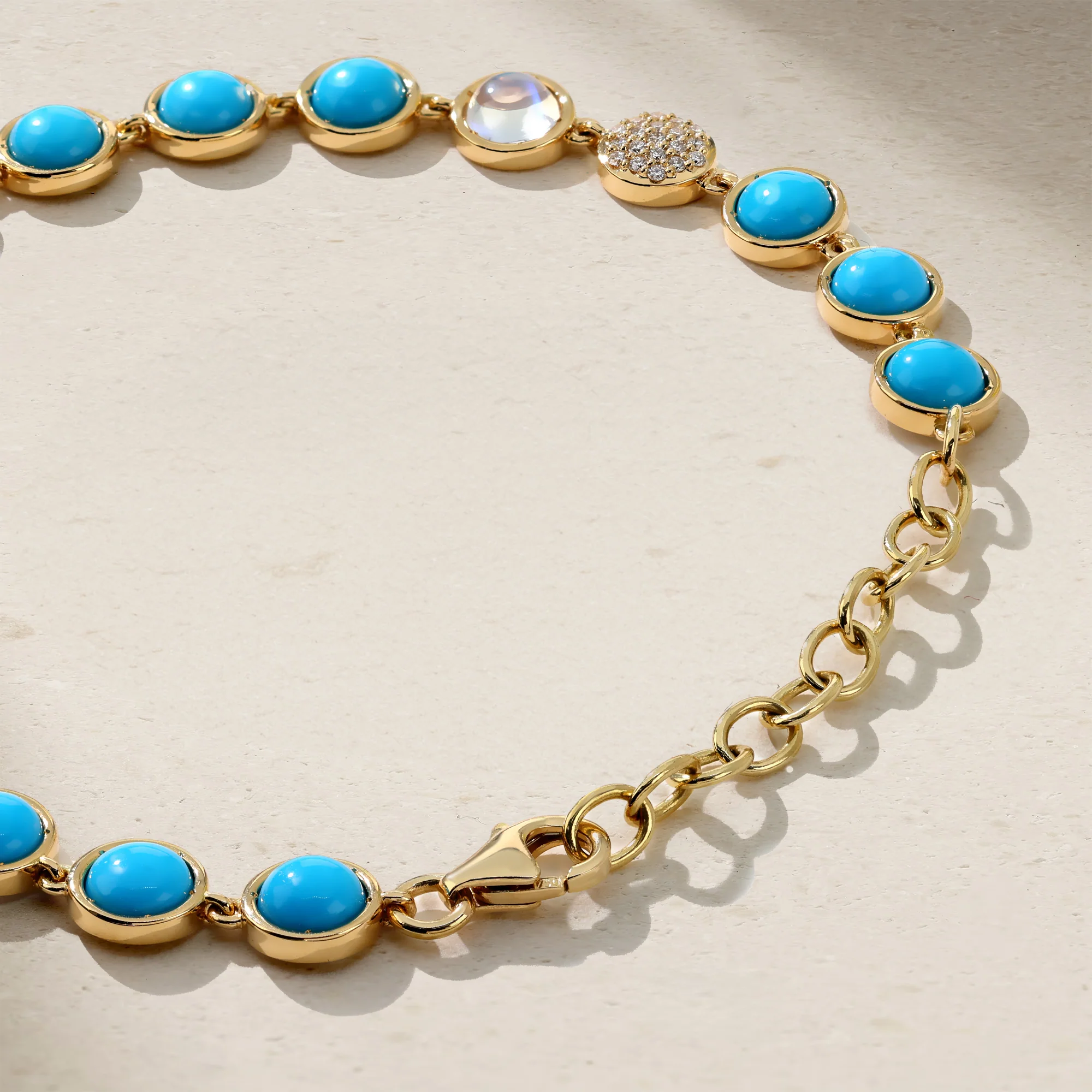 Our Bubble Diamond and Turquoise Bracelet features an assortment of striking round turquoise set within bezel frames and illuminated by stations of sparkling petite white diamond clusters and luminous moonstones positioned randomly along the strand. The bracelet measures 7.0" in total length and can be adjusted to and worn at shorter lengths to accommodate different wrist sizes. Wear yours alone or layer it together with other bracelets for a more personalized look.