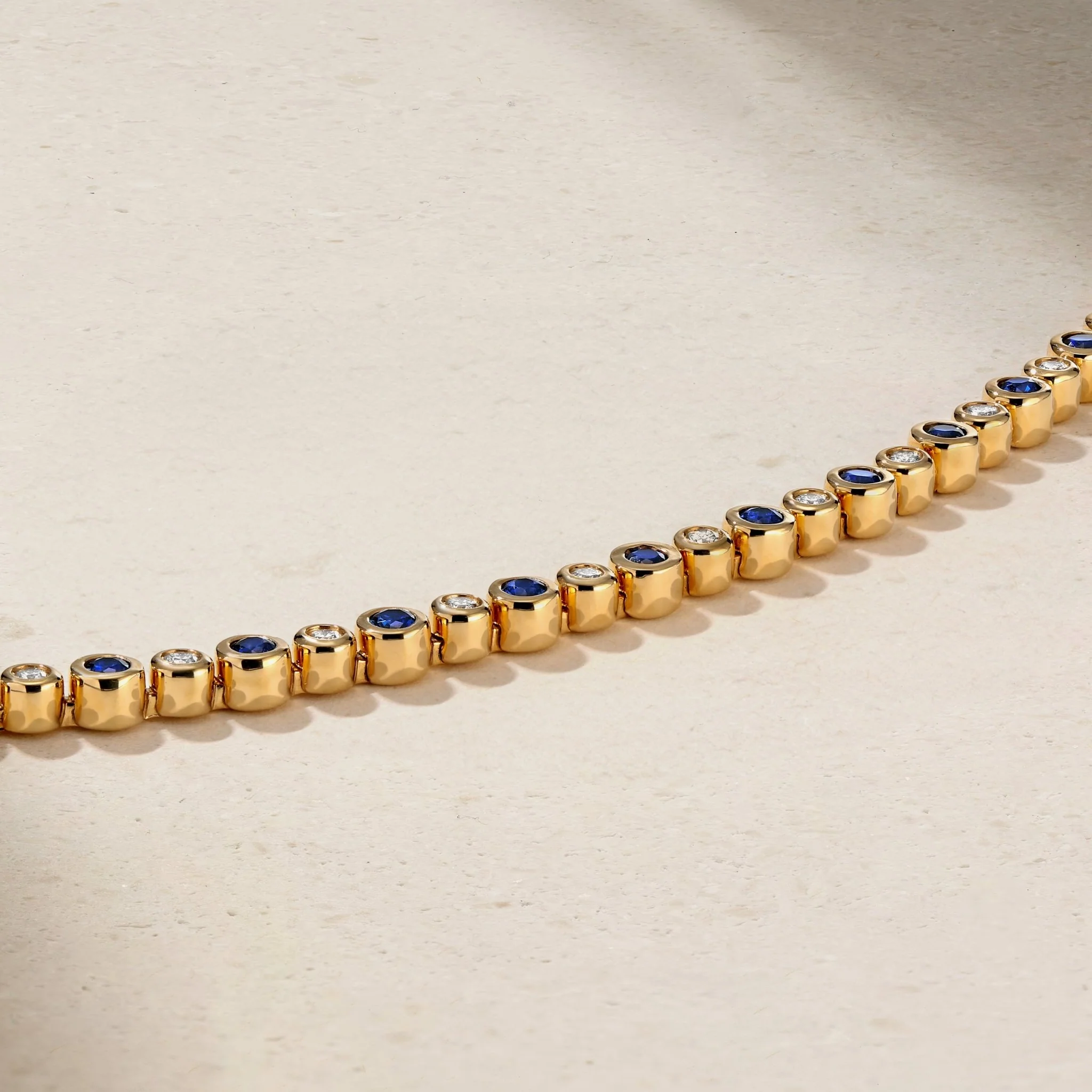 Brilliant blue sapphires and sparkling diamonds of alternating sizes are secured in bezels and fully wrap the wrist in this modern and whimsical line bracelet. Wear yours solo or layer it together with other dainty bracelets for a more personalized look.