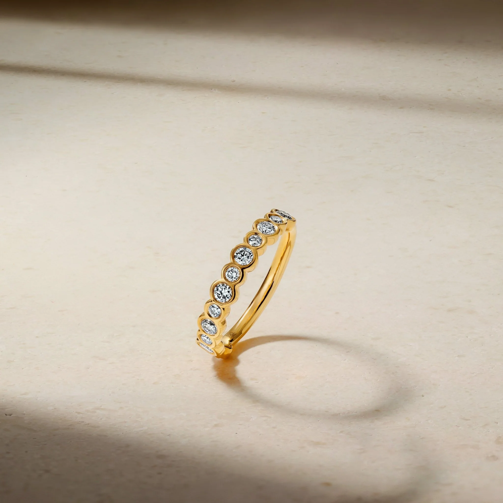Twinkling diamonds of alternating sizes are secured in bezels and encircle three quarters of the way around the finger in this modern and whimsical band. A wonderful choice as a wedding band, it can also serve as a perfect ring to stack or wear on its own.
