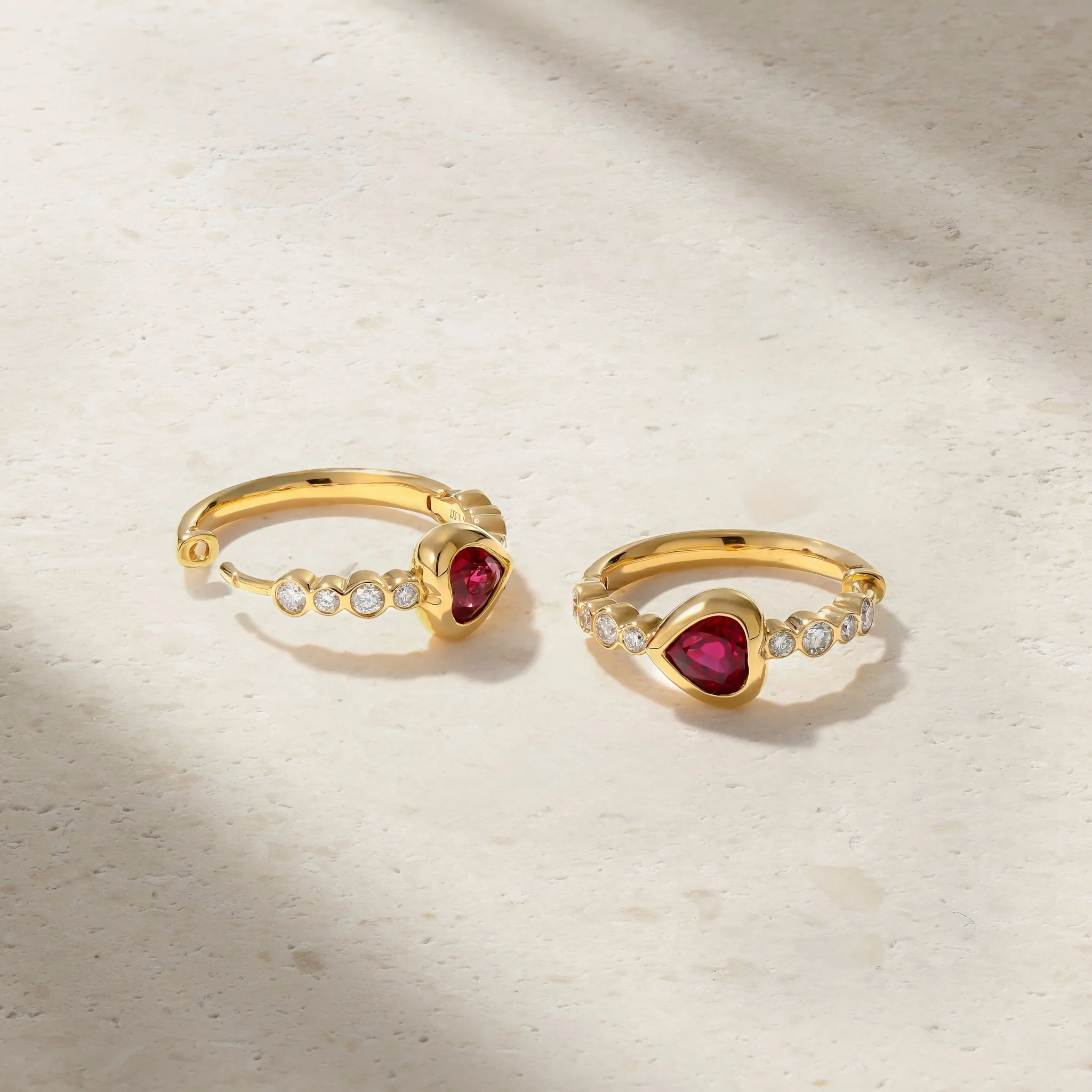Twinkling petite diamonds of mismatched sizes are set securely within thin bezel frames as they oscillate along the frontal portion of the small hoop. A beautiful heart shaped ruby is showcased as it rests at the center of the diamond traced section. We love these because they are lightweight and versatile to ensure that they will work for just about any occasion.