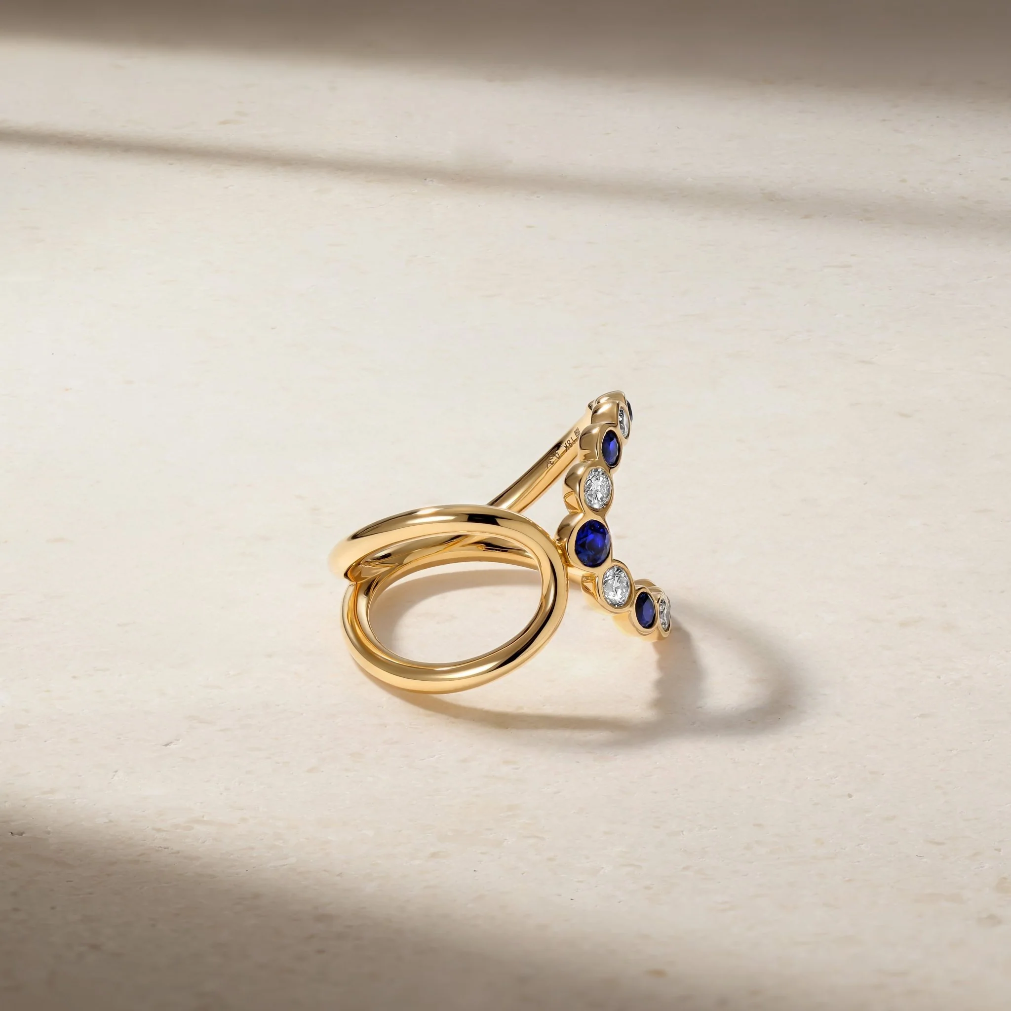 The striking, sculptural motif of our 'Elegance' ring encapsulates all that is grace and femininity. With the perfect combination of sparkle and polish, vibrant sapphires and twinkling white diamonds graduating in size are set in an ornate pattern along the larger swirl while a plain gold swirl wraps the finger and meets at the center. Wear yours solo on the index finger for a stylish impact.