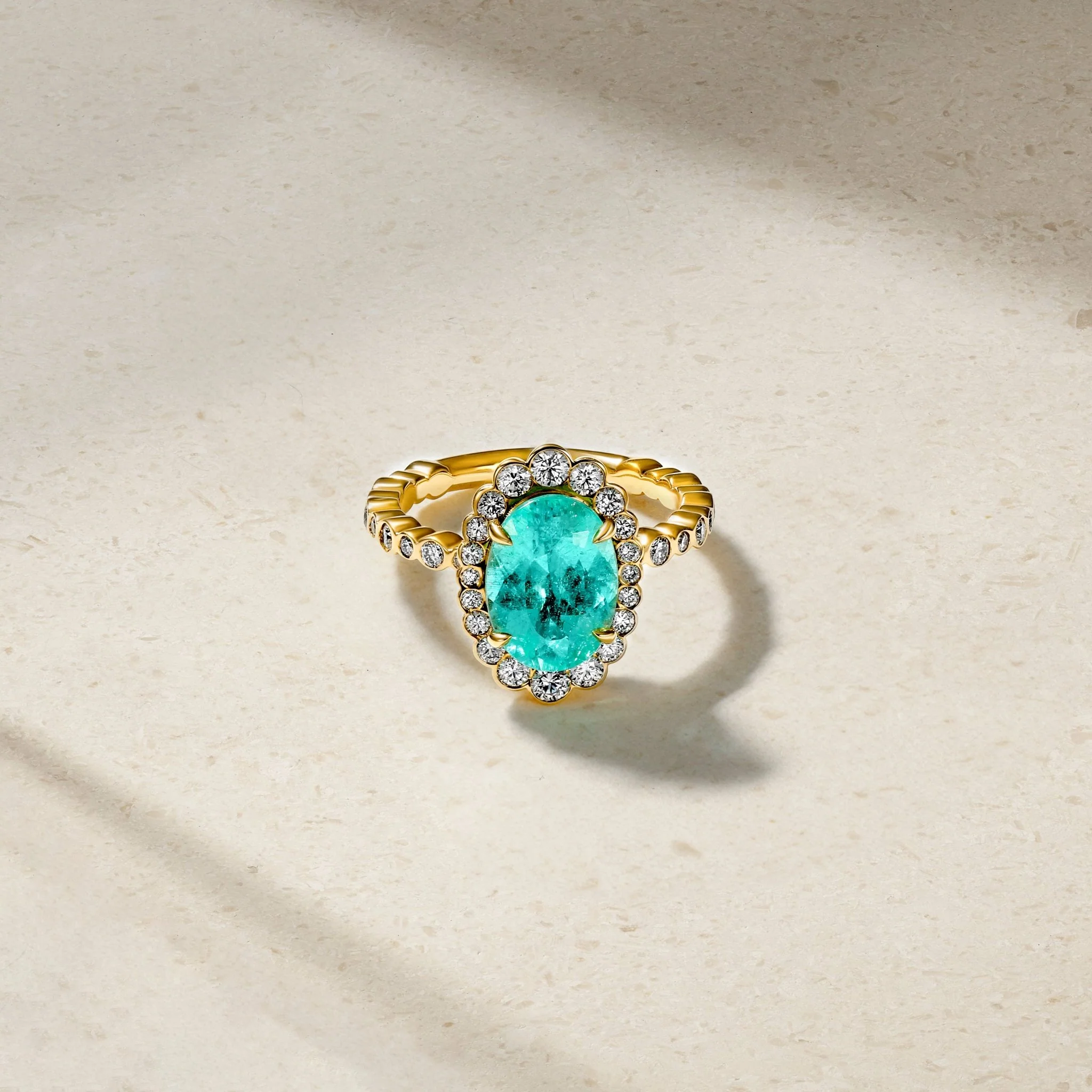 No small detail is overlooked in this elegant and progressive interpretation of the classic halo ring. This meticulously crafted ring is crowned with a neon Paraiba tourmaline and framed by a halo of glistening diamonds of graduating sizes all set within bezels. Additional diamonds extend along the shank and wrap the finger three quarters of the way for an added sparkle. Wear it solo as a statement piece for your next event.