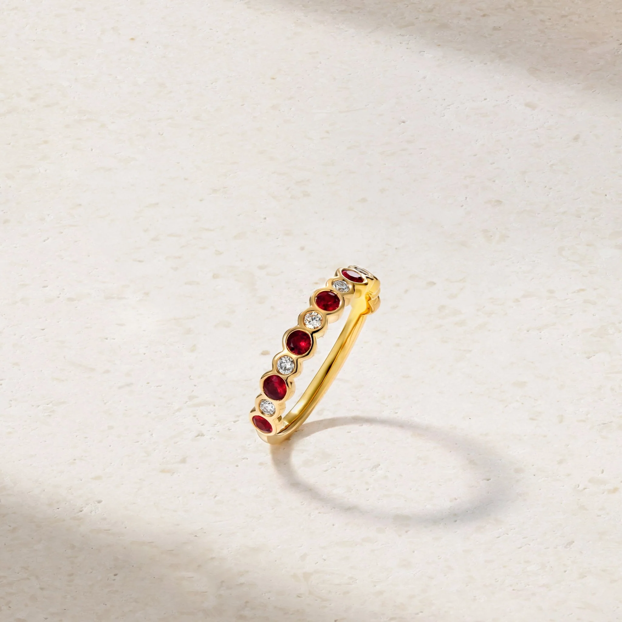 Rich red rubies and sparkling diamonds of alternating sizes are secured in bezels and encircle three quarters of the way around the finger in this modern and whimsical band. A wonderful choice as a wedding band, it can also serve as a perfect ring to stack or wear on its own.