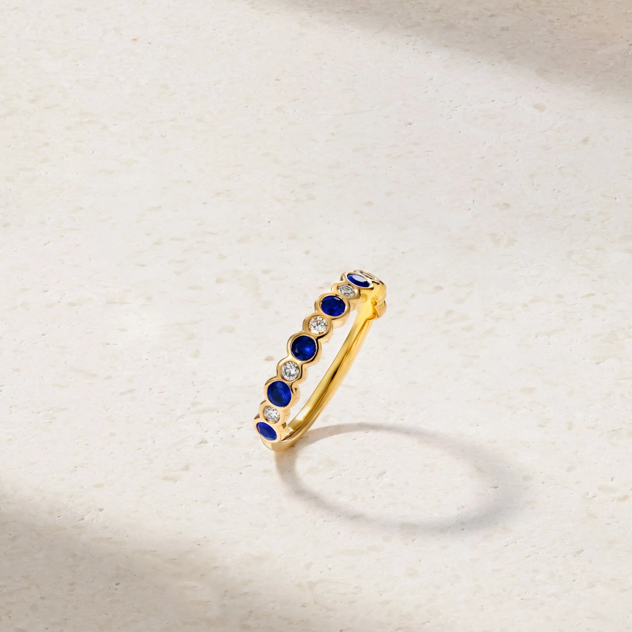 Brilliant blue sapphires and sparkling diamonds of alternating sizes are secured in bezels and encircle three quarters of the way around the finger in this modern and whimsical band. A wonderful choice as a wedding band, it can also serve as a perfect ring to stack or wear on its own.