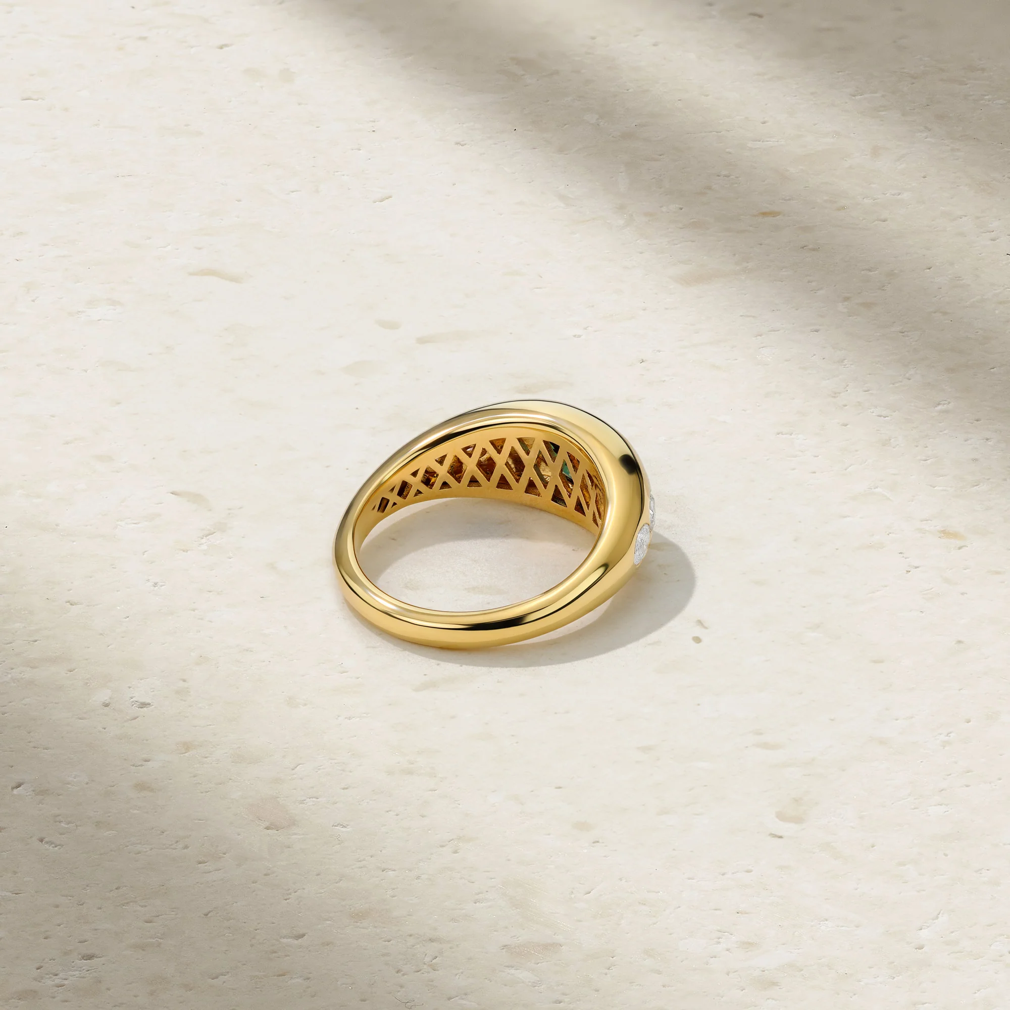 This contemporary gypsy-set ring showcases a striking combination of a captivating alexandrite gemstone coupled with an assortment of dazzling oval shaped diamonds. The alexandrite, known for its rare color-changing properties, sits at the center of the design, exuding a unique brilliance that shifts from deep green to purplish-red depending on the light. Flanking the alexandrite are oval shaped diamonds that add a timeless sparkle, creating a perfect balance between modern elegance and classic sophistication. The gypsy setting, with its sleek and minimalistic design, ensures that all stones are securely nestled in the band, offering a seamless and polished finish. This ring is a true statement piece, ideal for those who appreciate bold, yet refined luxury.