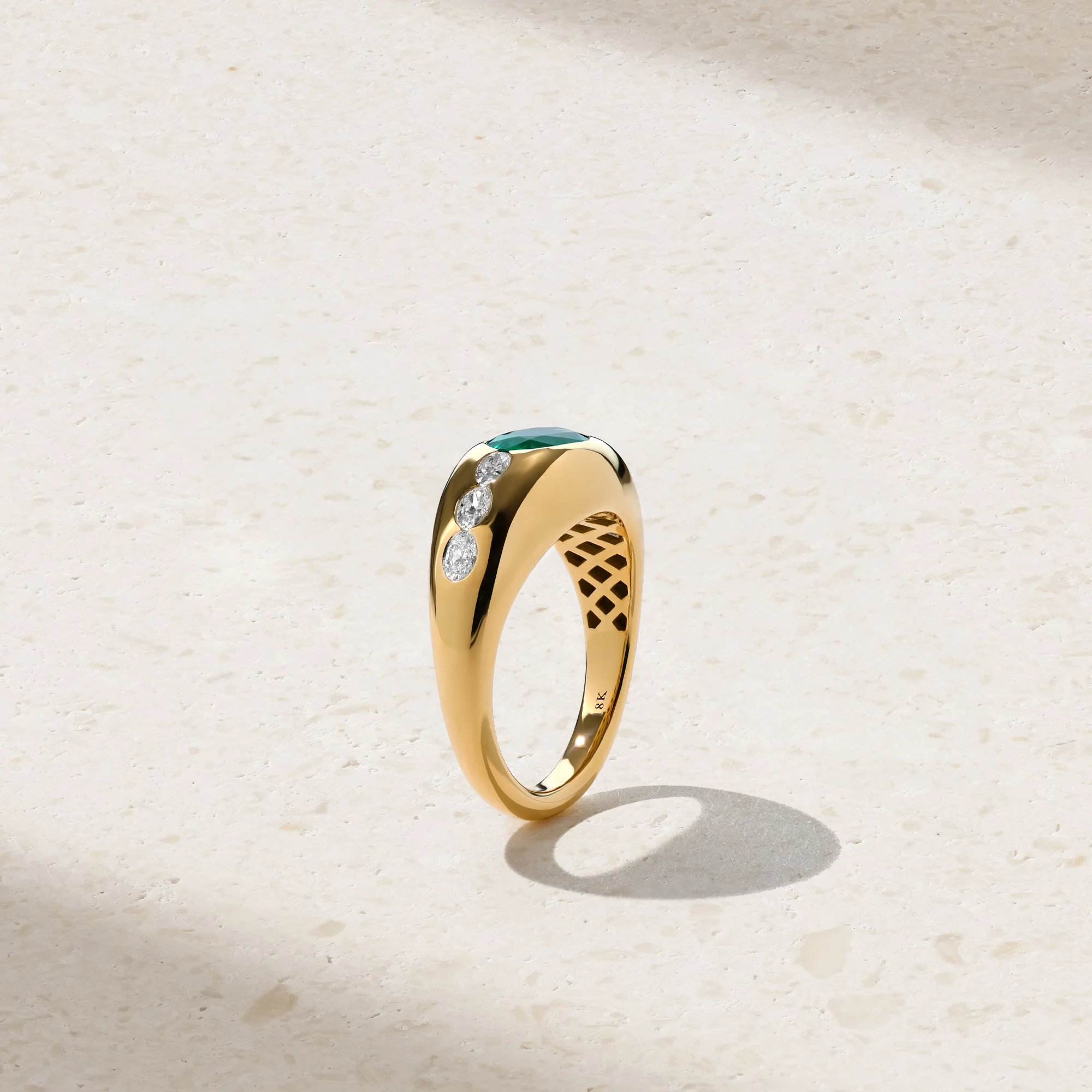 This contemporary gypsy-set ring showcases a striking combination of a vivid emerald gemstone coupled with an assortment of dazzling oval shaped diamonds. At the center of the design lies a vibrant emerald that is set in an east-west orientation. Flanking it is an assortment of oval shaped diamonds, their brilliant facets catching the light with every movement. The gypsy setting, with its sleek and minimalistic design, ensures that all stones are securely nestled in the band, offering a seamless and polished finish. This ring is a true statement piece, ideal for those who appreciate bold, yet refined luxury.