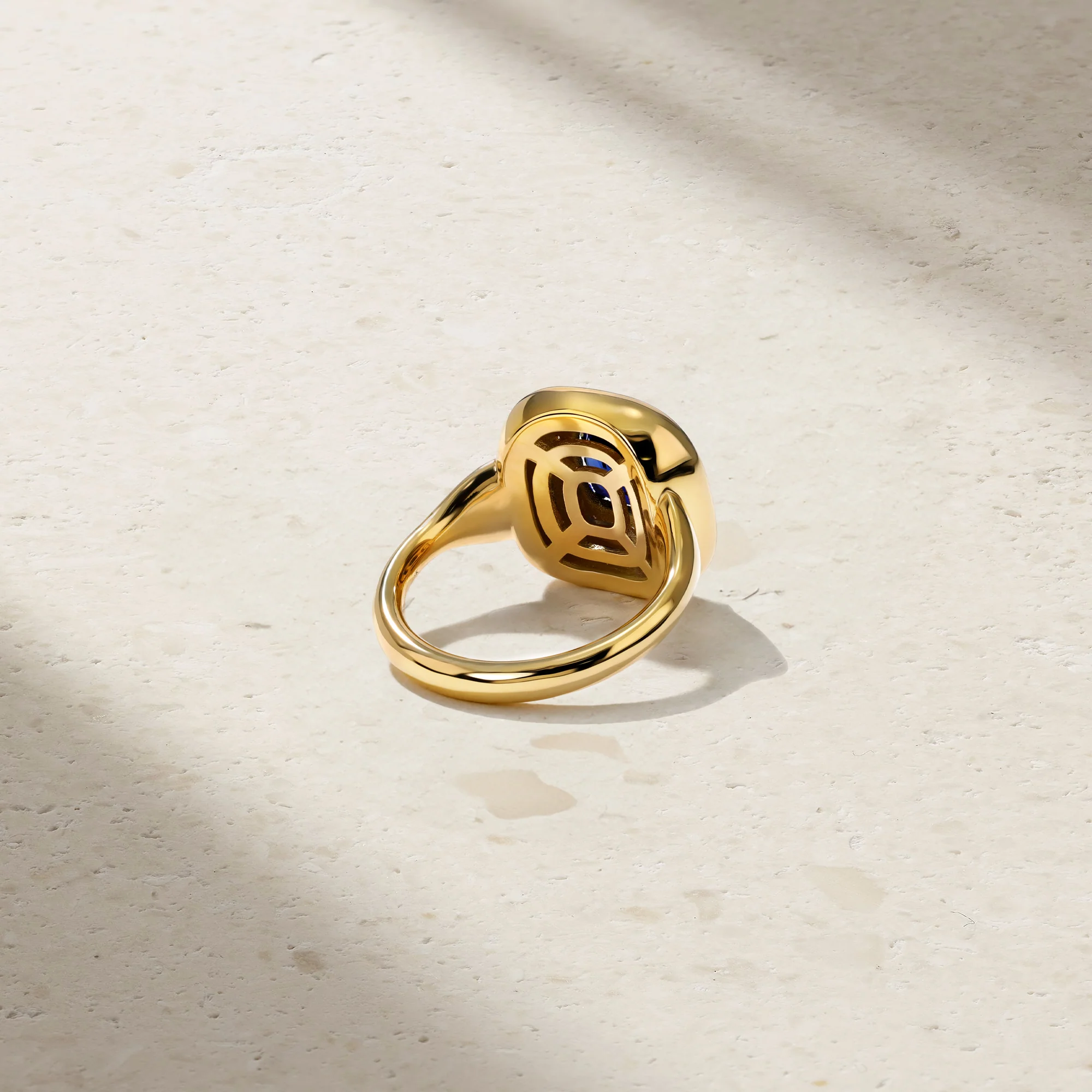 A testament to timeless elegance, this ring features a captivating cushion-cut sapphire encircled by a delicate halo of twinkling diamonds. The bold gold setting, with its soft, rounded form, evokes the sentimentality of a cherished keepsake while offering a distinctly modern silhouette. Designed to be treasured and passed down, this piece carries the quiet strength and beauty of an heirloom, seamlessly blending heritage craftsmanship with contemporary allure.