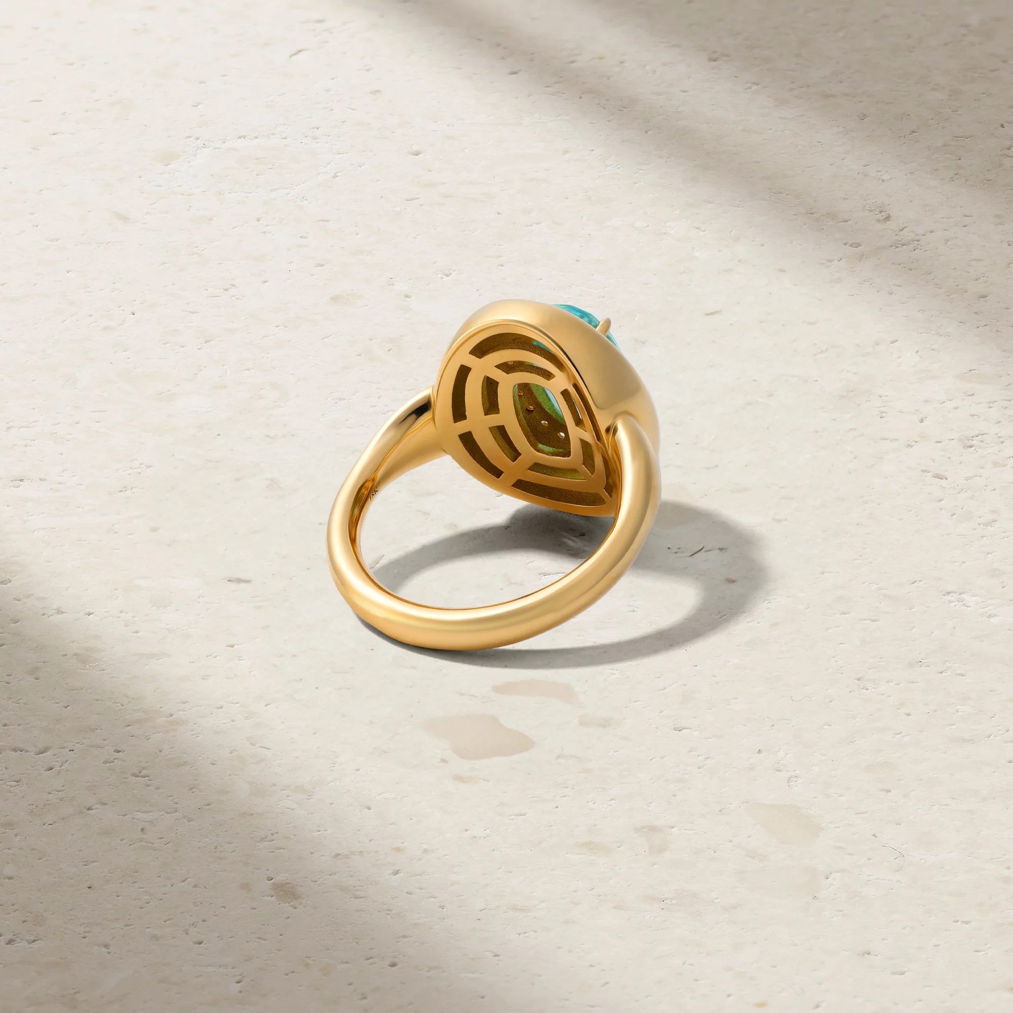 A vivid Paraiba tourmaline glows at the center of this captivating ring, its electric blue hue illuminated by a delicate halo of brilliant diamonds. The luminous gemstone is framed within a sculptural oval of polished yellow gold, creating a bold, fluid silhouette that feels both modern and timeless. The contrast between the vibrant Paraiba and the warm gold setting draws the eye inward, allowing the gemstone’s extraordinary color to take center stage. Effortlessly elegant yet distinctly striking, this piece celebrates the magic of rare color through a playful balance of brilliance, gold, and contemporary design.
