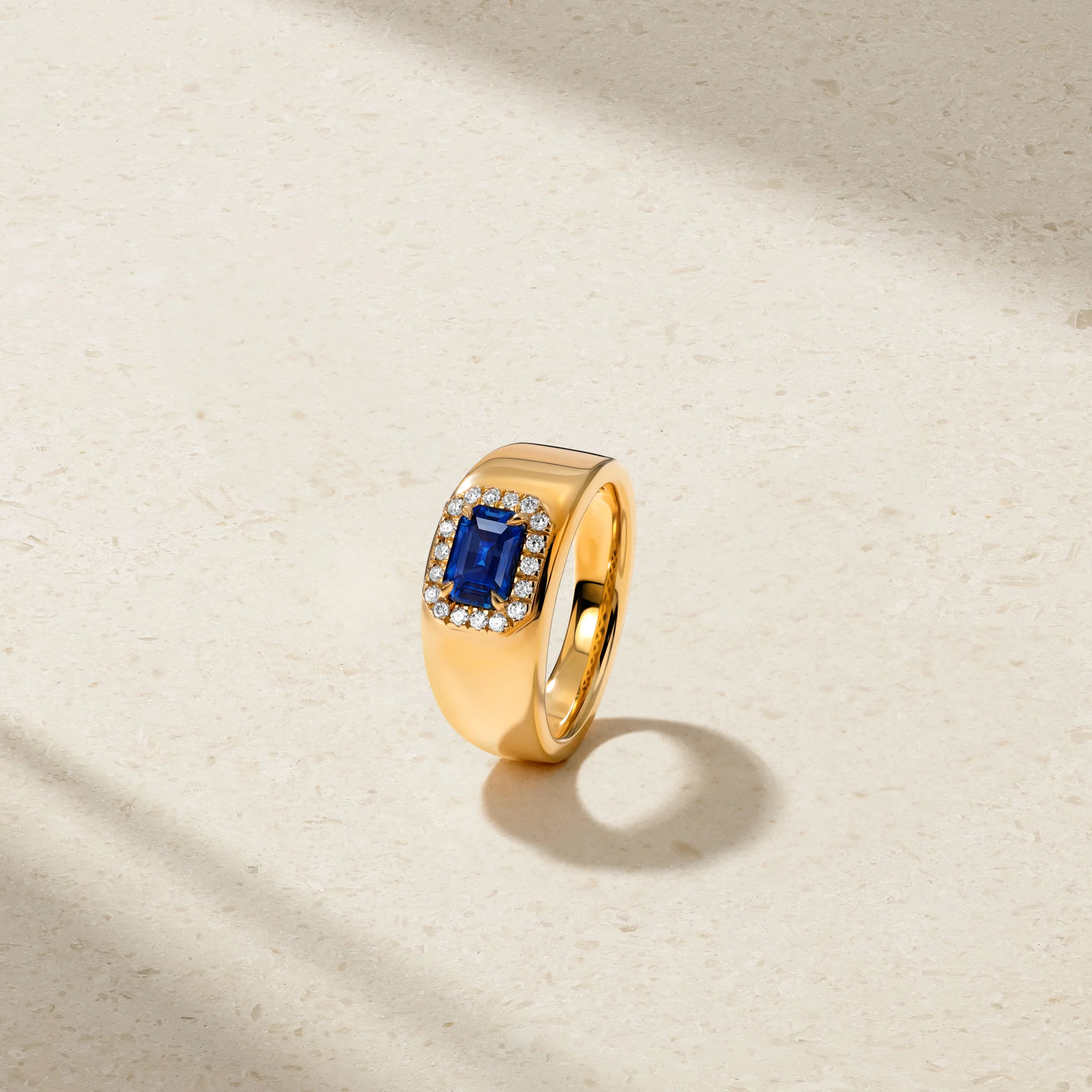 This statement ring reimagines classic elegance with bold modernity. A beautiful octagonal sapphire anchors the design, framed by a delicate halo of brilliant diamonds that accentuate its midnight-blue allure. Set atop a broad, high-polished gold band, the piece evokes the grandeur of vintage cocktail rings while maintaining a distinctly contemporary edge. Whether worn solo or styled with slender bands, it’s a timeless design destined to be passed down for generations.
