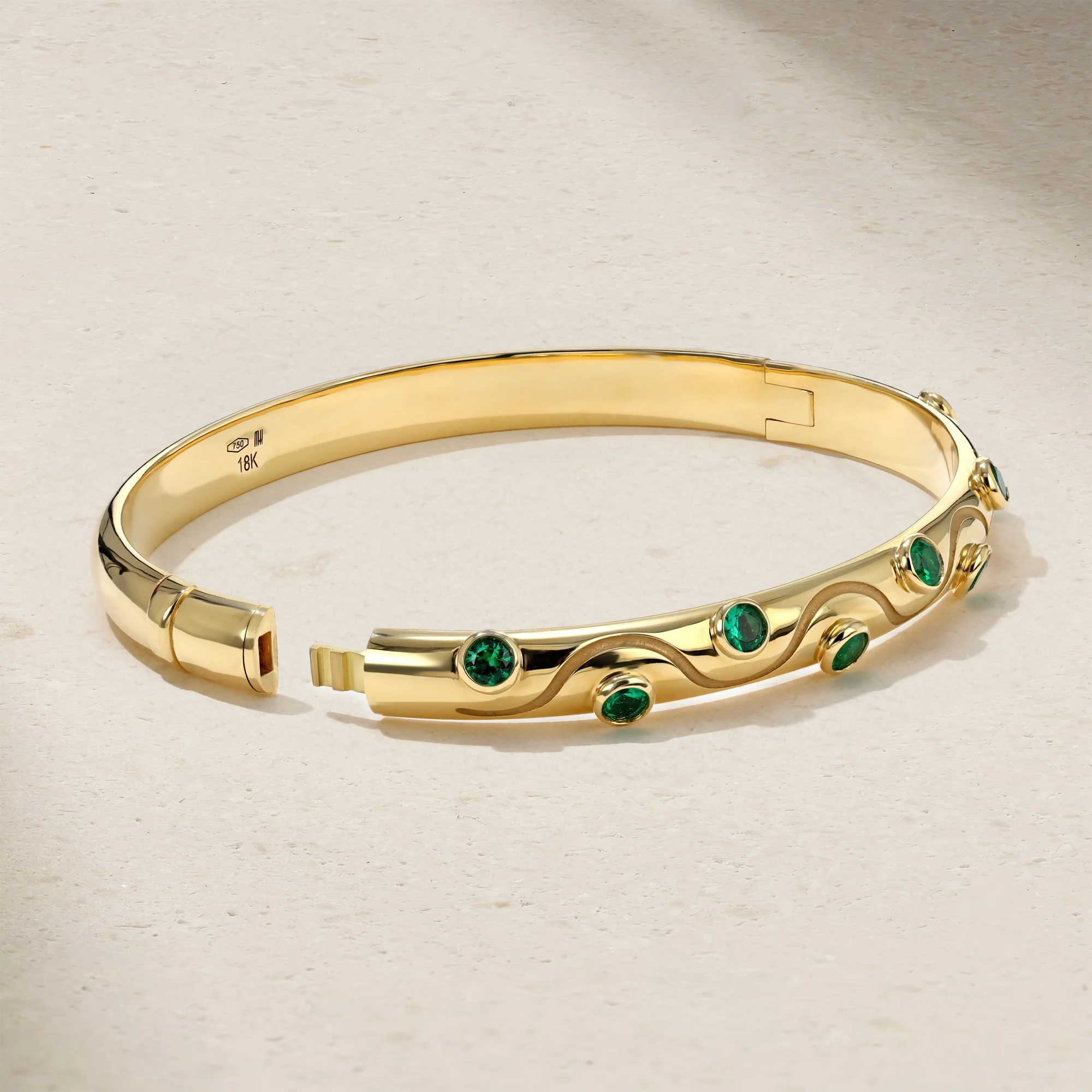 Inspired by the graceful rhythm of moving water, the Riva Crest Bangle features a sinuous gold silhouette punctuated by a sequence of bezel-set emeralds. Each vivid green stone is carefully placed along the gentle wave-like contour, evoking the fluidity and femininity of a flowing current. Designed to echo both movement and balance, this sculptural piece brings a touch of bold elegance to the wrist. Wear it alone for a refined statement, or stack it to create a more personalized expression.