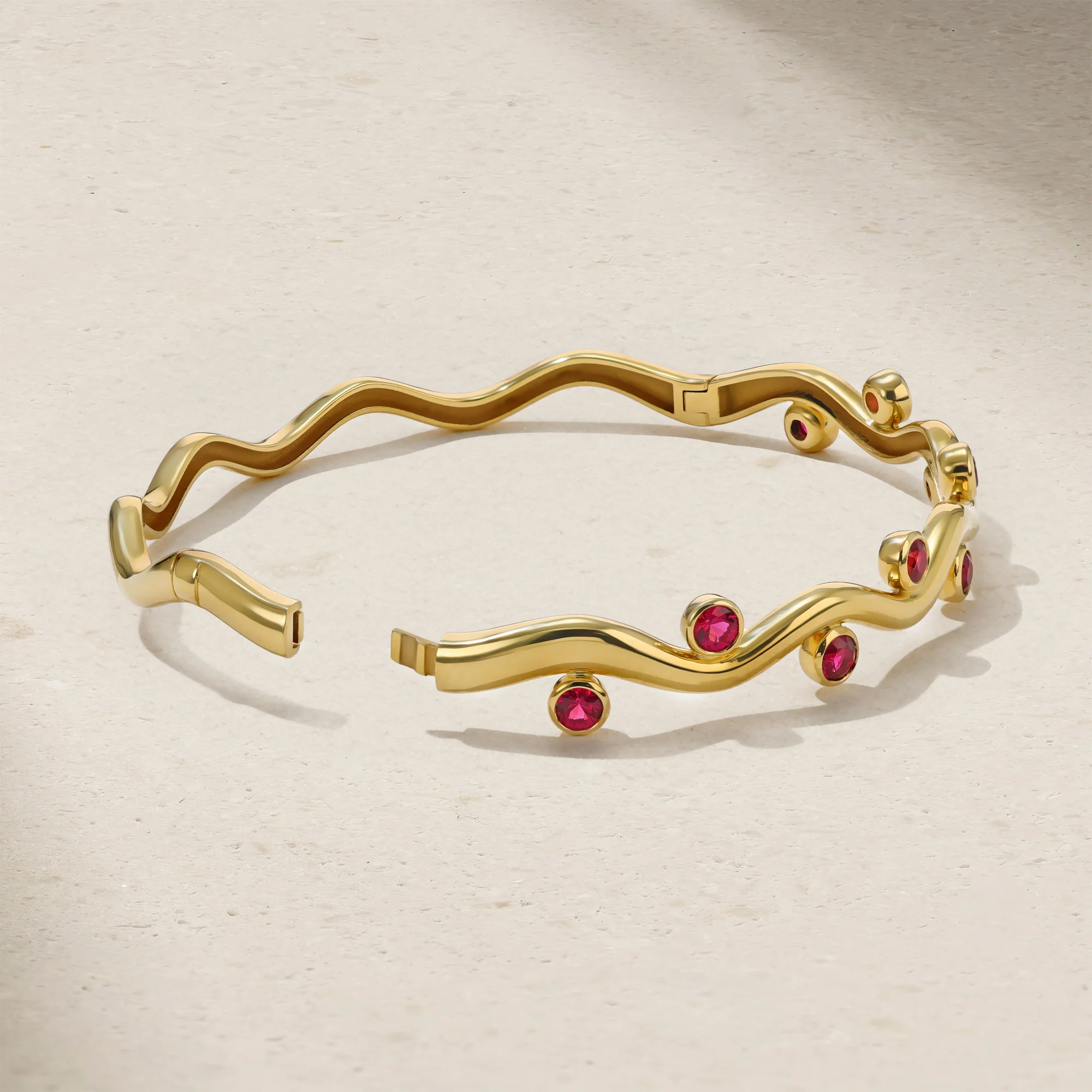 Whimsical yet polished, this sculptural bangle brings fluidity and a pop of color to the wrist. Crafted in rich yellow gold, its undulating silhouette evokes the movement of gentle waves, punctuated by bezel set rubies that shimmer along every curve. Sleek and refined with a touch of playfulness, it wears beautifully on its own or stacked with other favorites for a more expressive look. A modern classic designed to flow effortlessly from day to night.
