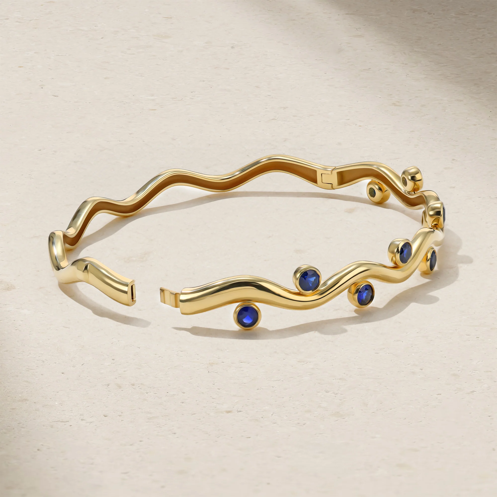 Whimsical yet polished, this sculptural bangle brings fluidity and a pop of color to the wrist. Crafted in rich yellow gold, its undulating silhouette evokes the movement of gentle waves, punctuated by bezel set sapphires that shimmer along every curve. Sleek and refined with a touch of playfulness, it wears beautifully on its own or stacked with other favorites for a more expressive look. A modern classic designed to flow effortlessly from day to night.