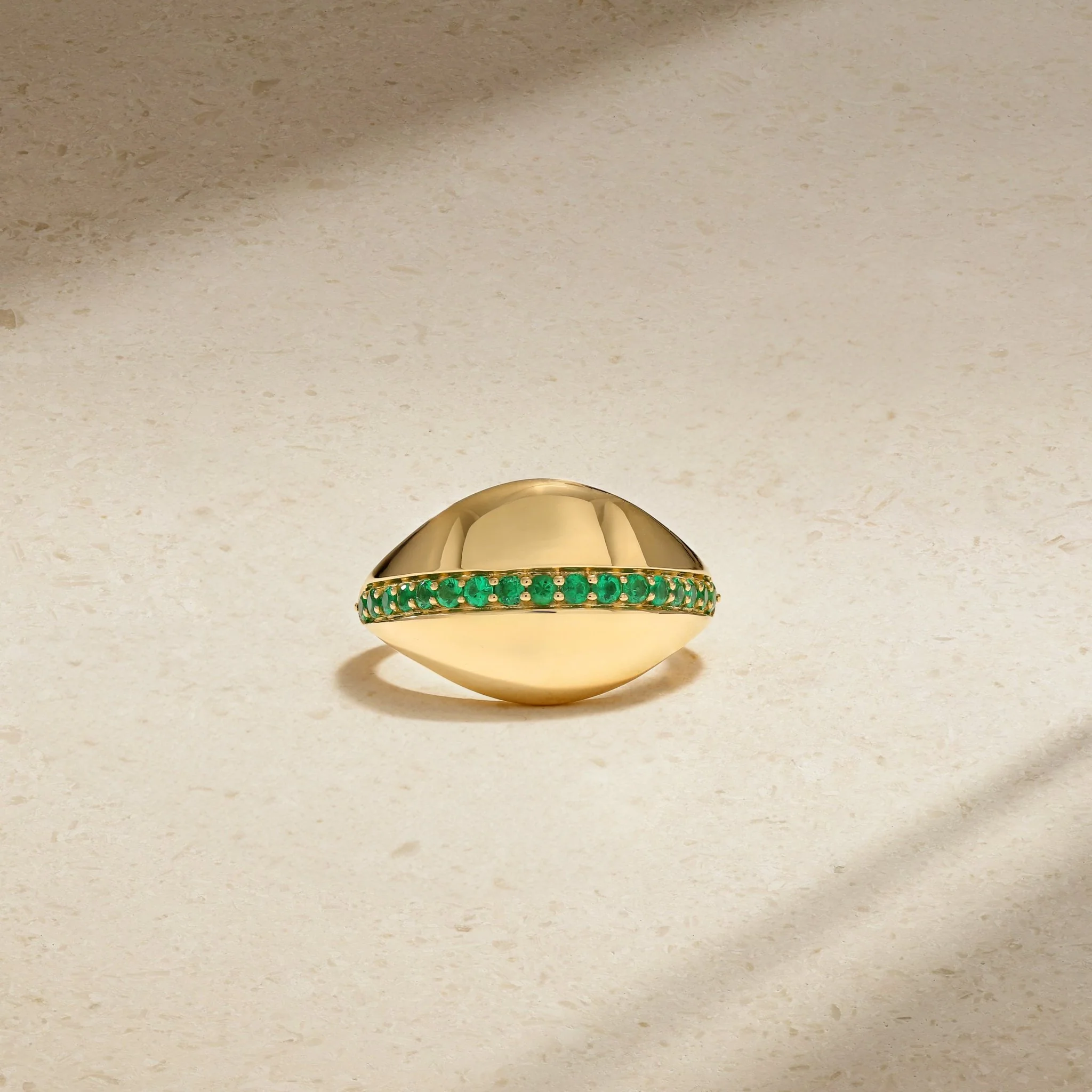A fun ring that's both sleek and contemporary and infused with heirloom quality, our Saturn Ring is surprisingly lightweight and features a slightly domed top that's inlaid with a row of beautiful emeralds. The metal has been polished with a high luster and lays flush against the finger making it an ideal choice for every day. Wear yours alone alongside other daintier rings.