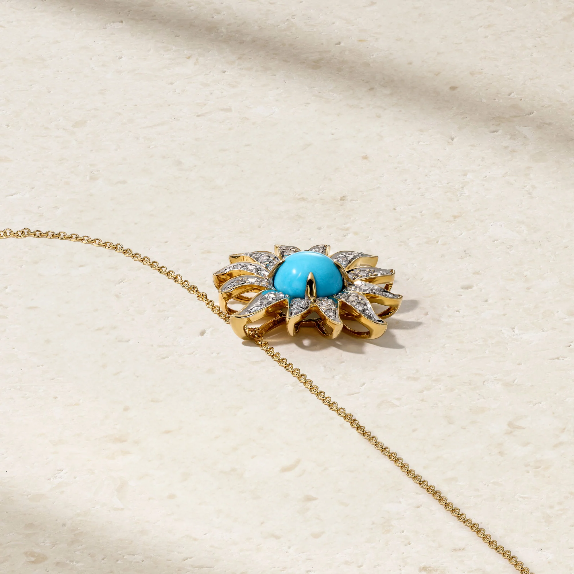 Our Solstice Pendant features a radiant turquoise set at the center of this sun themed design. Each ray protruding from the center is set with an assortment of shimmering white diamonds that beautifully accentuate the characteristic blue hues of the turquoise. The pendant is suspended from a delicate 18" cable link chain. Layer this together with other necklaces from your jewelry wardrobe for a whimsical, fashion forward look.