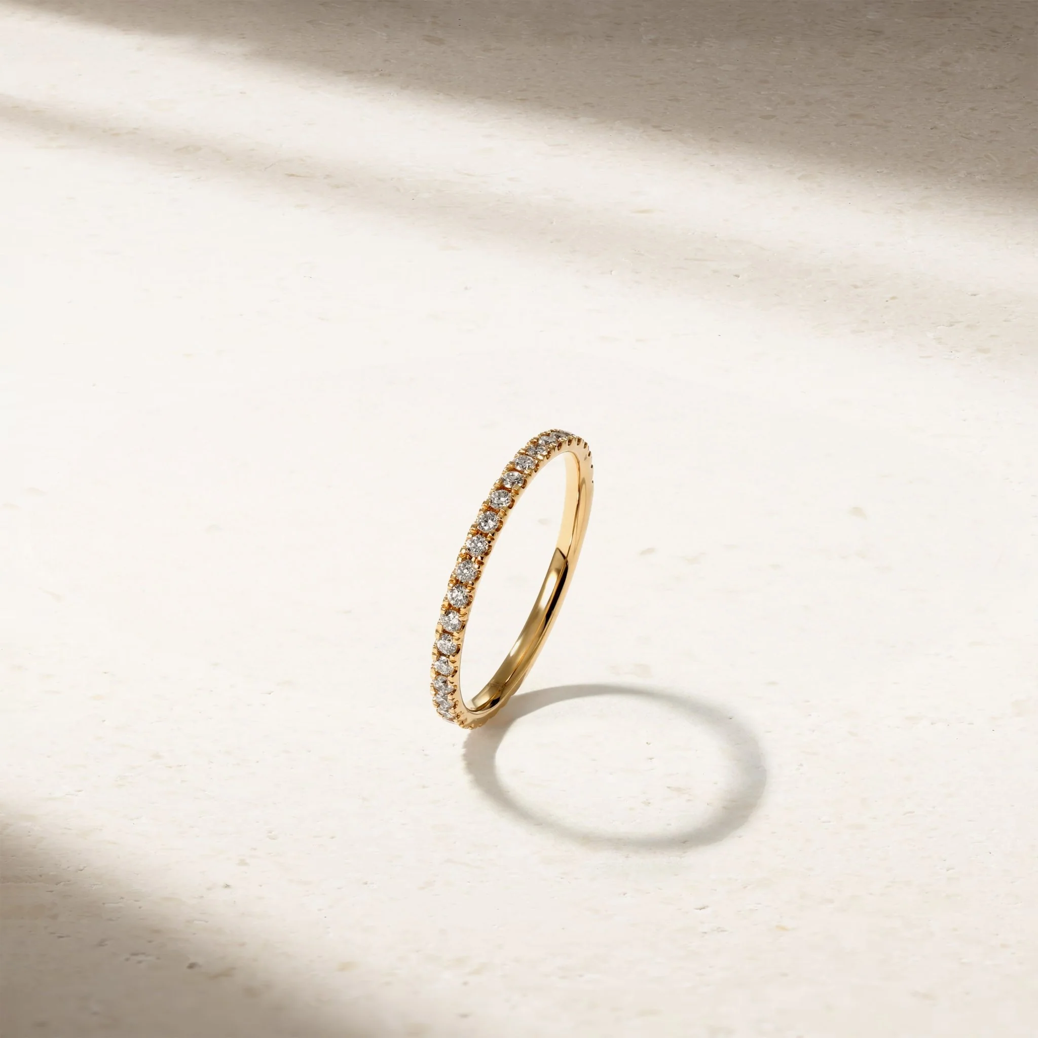 Loved for its barely there, stackable design and versatility, our Thread Ring is the most perfect choice for the modern woman. Twinkling petite diamonds are hand set in elegantly sculpted prongs that extend three quarters around the finger. For the minimalist, we love it as an everyday essential that can be worn on its own for an elegant and understated appearance. For those who fancy a more elaborate look, stack together multiples for a more significant statement. It can also serve as a beautiful companion to your engagement ring.