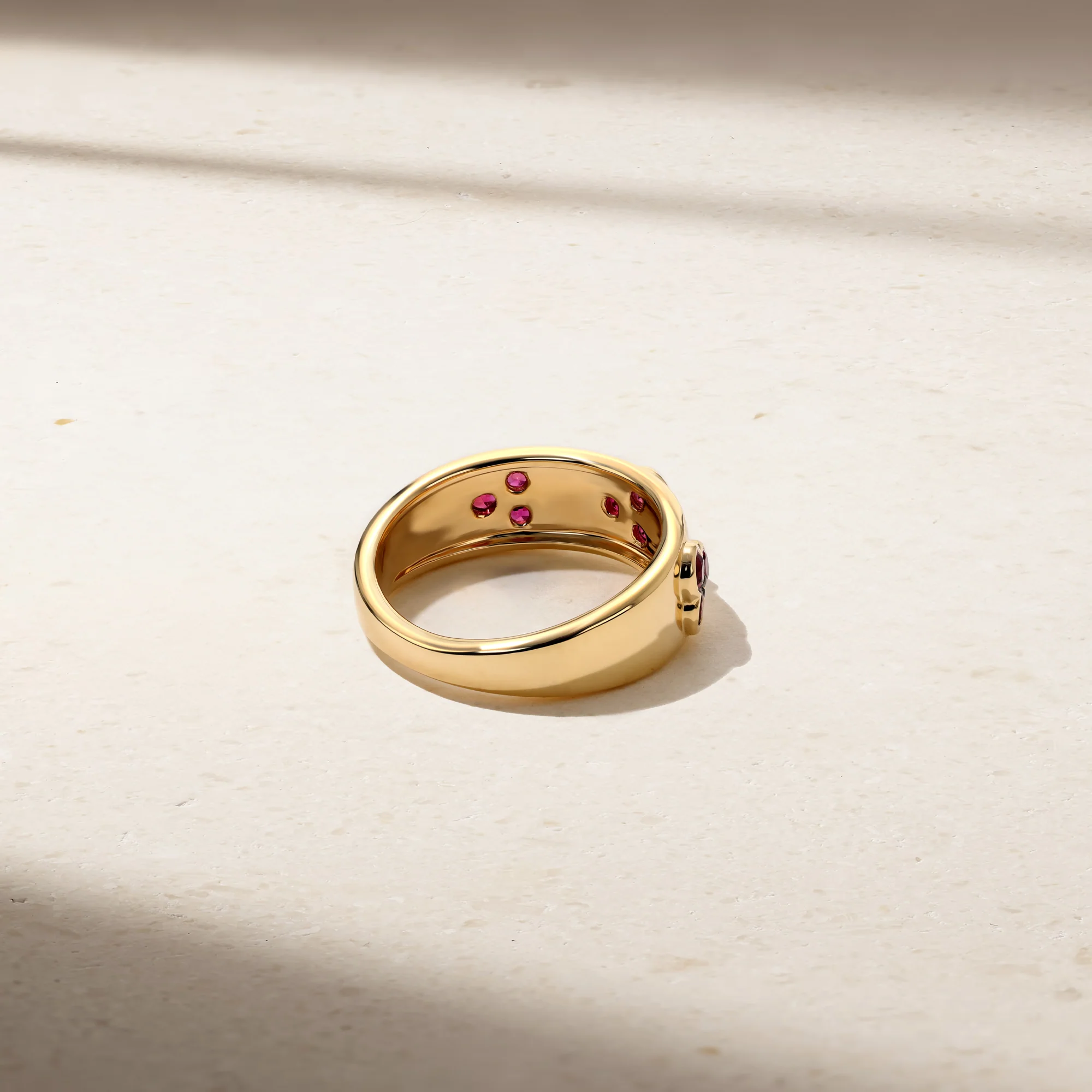 Inspired by classic cigar bands, we've added a unique touch to this ring by incorporating trios of rubies that are carefully set within sleek and contemporary half bezel stations along the top of a wide band. Wear it solo for a bold statement.